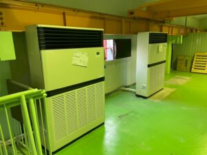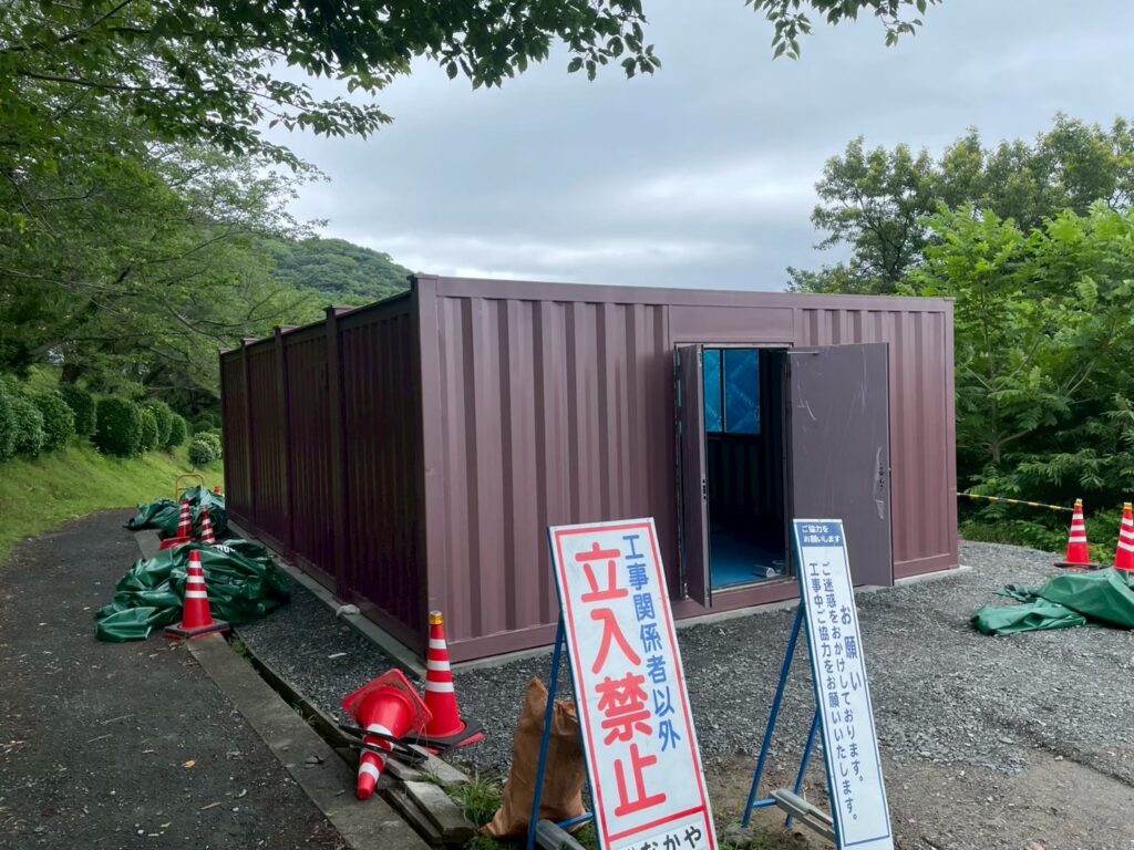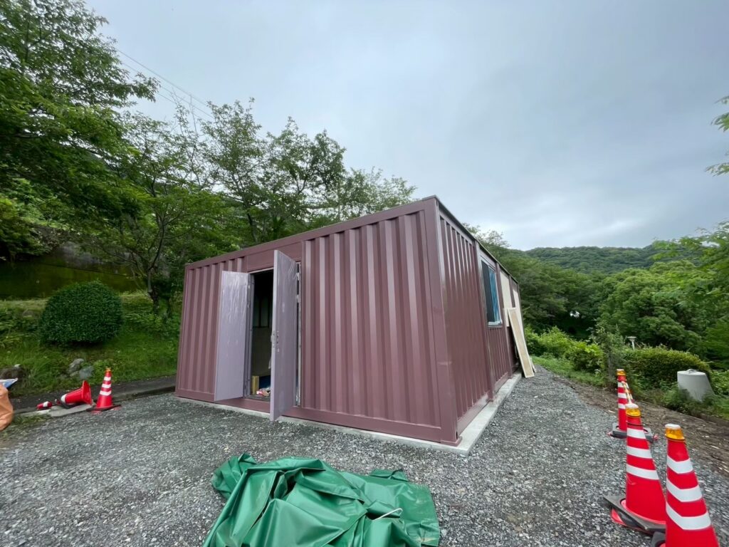 コンテナを積んだトレーラーが入っていけない場所の為、社内で知恵を出し合い試行錯誤の末、無事設置することができました。